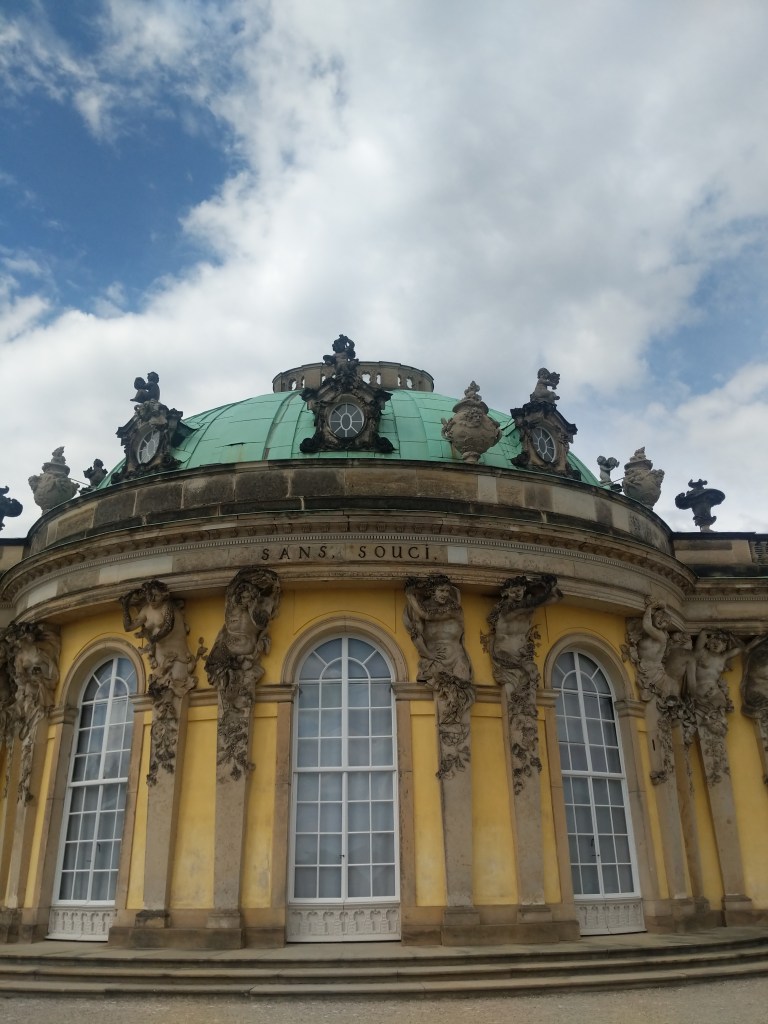 After lunch we made our way towards Sans Souci, the beautiful palace of Frederick the Great. Georgina did a great job of walking us through the many Fredericks (or more precisely Friedrichs) in Prussian history, and after her tale of Frederick the Great, I was completely enthralled by this emperor. European history for me is largely through an Anglo-Saxon post-colonial cultural filter. Perhaps he was fleetingly mentioned when we read a bit about Bismarck in school. I think what touched me most was the story of his teenage crush (?) and subsequent escape with his tutor. Frederick’s father (also a Frederick) was a tough man who didn’t like the softer side of life, and when his prodigal son was brought back, Frederick Sr. had the tutor executed while the son watched. Ironically, Frederick Jr. saw more military action than his father ever did, expanding and strengthening the Prussian empire; however his heart was still artistic. At any moment he could, he used to escape into the beauty of Potsdam and to his palace that he called…Sans Souci, in French“without a care“.